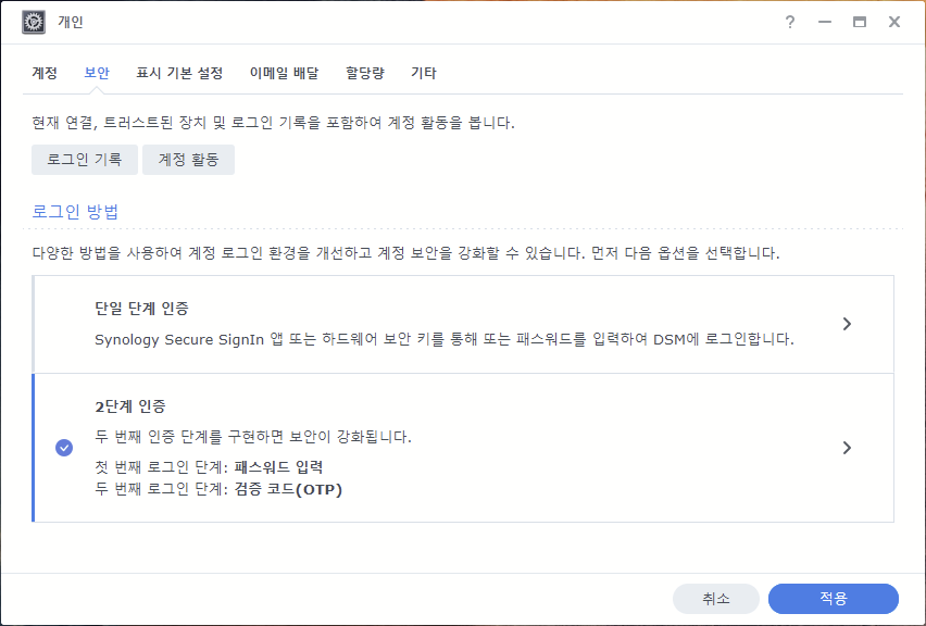 Synology NAS - 사용자 계정 2차 인증 설정