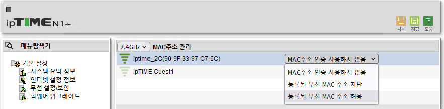 보통은 "등록된 무선 MAC 주소 허용"을 사용하여 사전에 등록된 단말만 접속하도록 설정하는 것이 일반적이다.