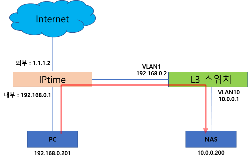 아래 구성처럼 IPtime과 L3스위치(또는 라우팅 기능이 있는 장비) 등을 연결하여 라우팅 설정을 통해 서로 통신이 가능하도록 설정할 수 있다.