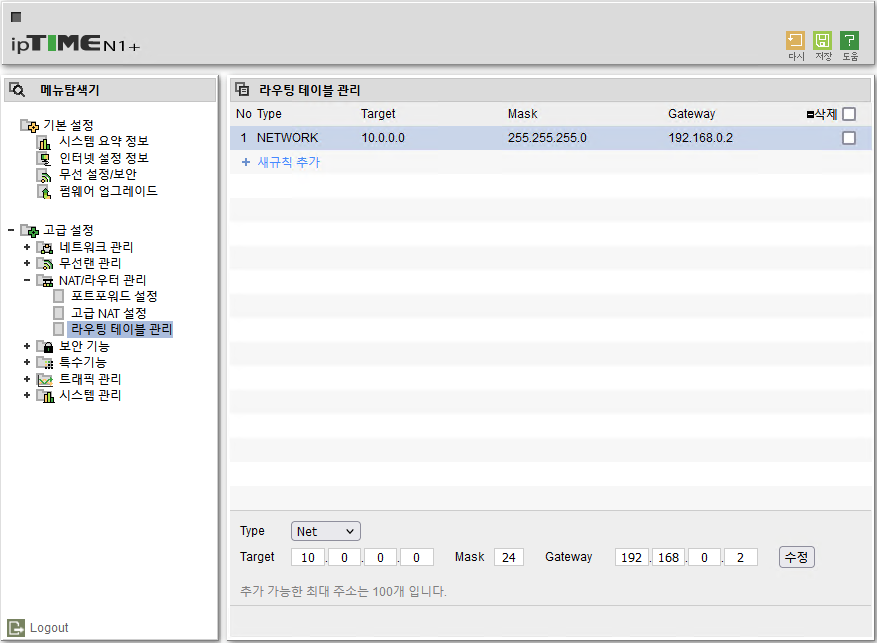 1. 고급 설정 → NAT/라우터 관리 → 라우팅 테이블 관리