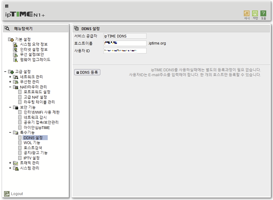 1. 고급 설정 → 특수기능 → DDNS 설정