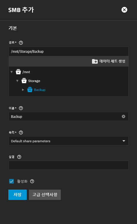 3) "경로(Path)" 필드에서 위에서 만든 데이터셋의 경로를 선택한다. (예: /mnt/pool_name/smb_share).